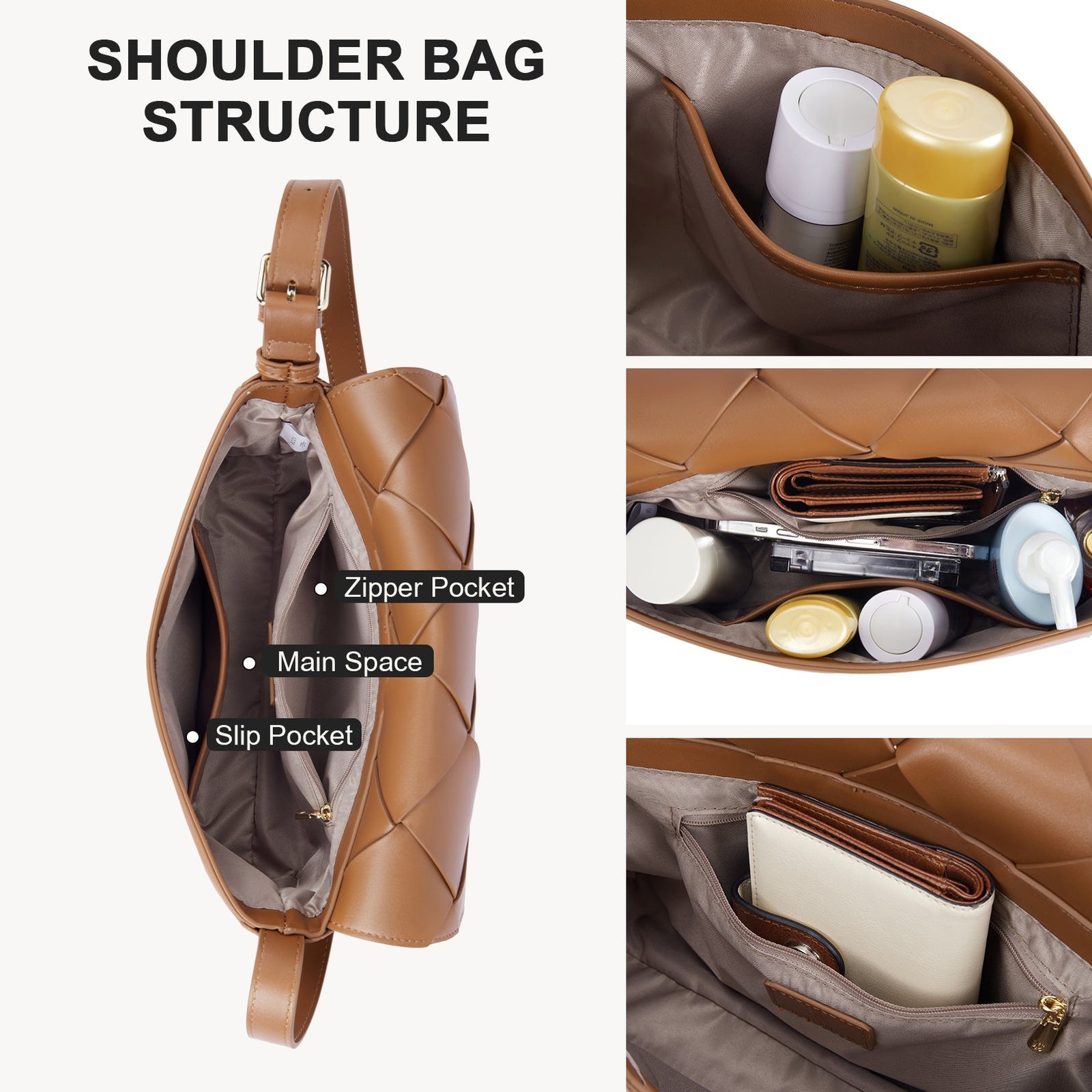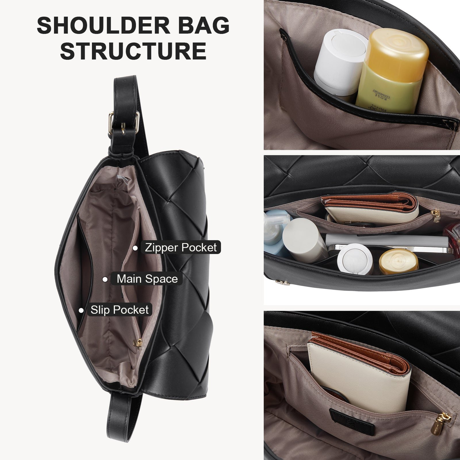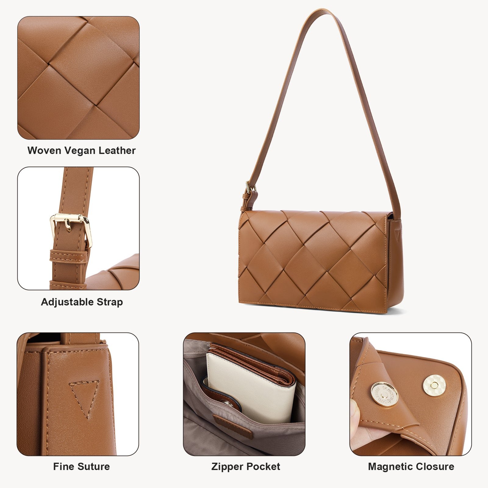 - Multi-Compartment Purse: The Woven purse features a main compartment that closes with magnetic clasps. a sliding inner pocket and a zipper pocket for easy storage of items such as cellphones. keys. lipsticks. wallets and sunglasses. At the same time. the magnetic buckle pocket is easy to place or take out everyday items such as wallets. cash and credit cards. ensuring that every trip is organized